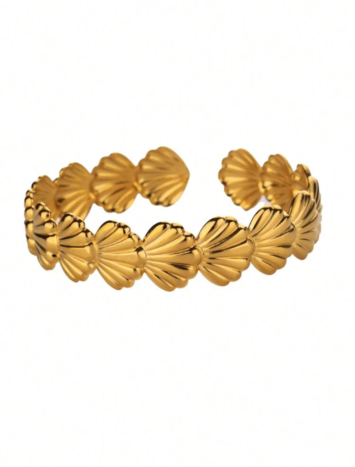 Our Shells Cuff Bangle is an exquisite piece of jewelry, made from high-quality stainless steel and finished with a fine 18-carat gold plating. This elegant design combines durability with timeless elegance.