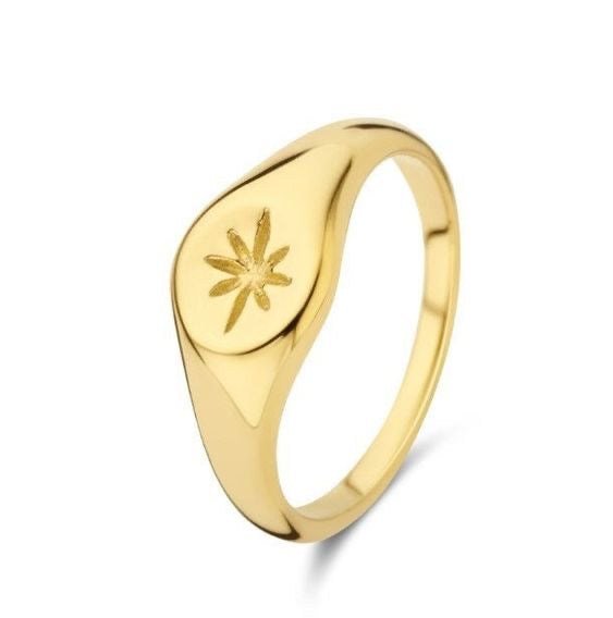 Our Star Signet Ring is an exquisite piece of jewelry, made from high-quality stainless steel and finished with a fine 18-carat gold plating. This elegant design combines durability with timeless elegance.