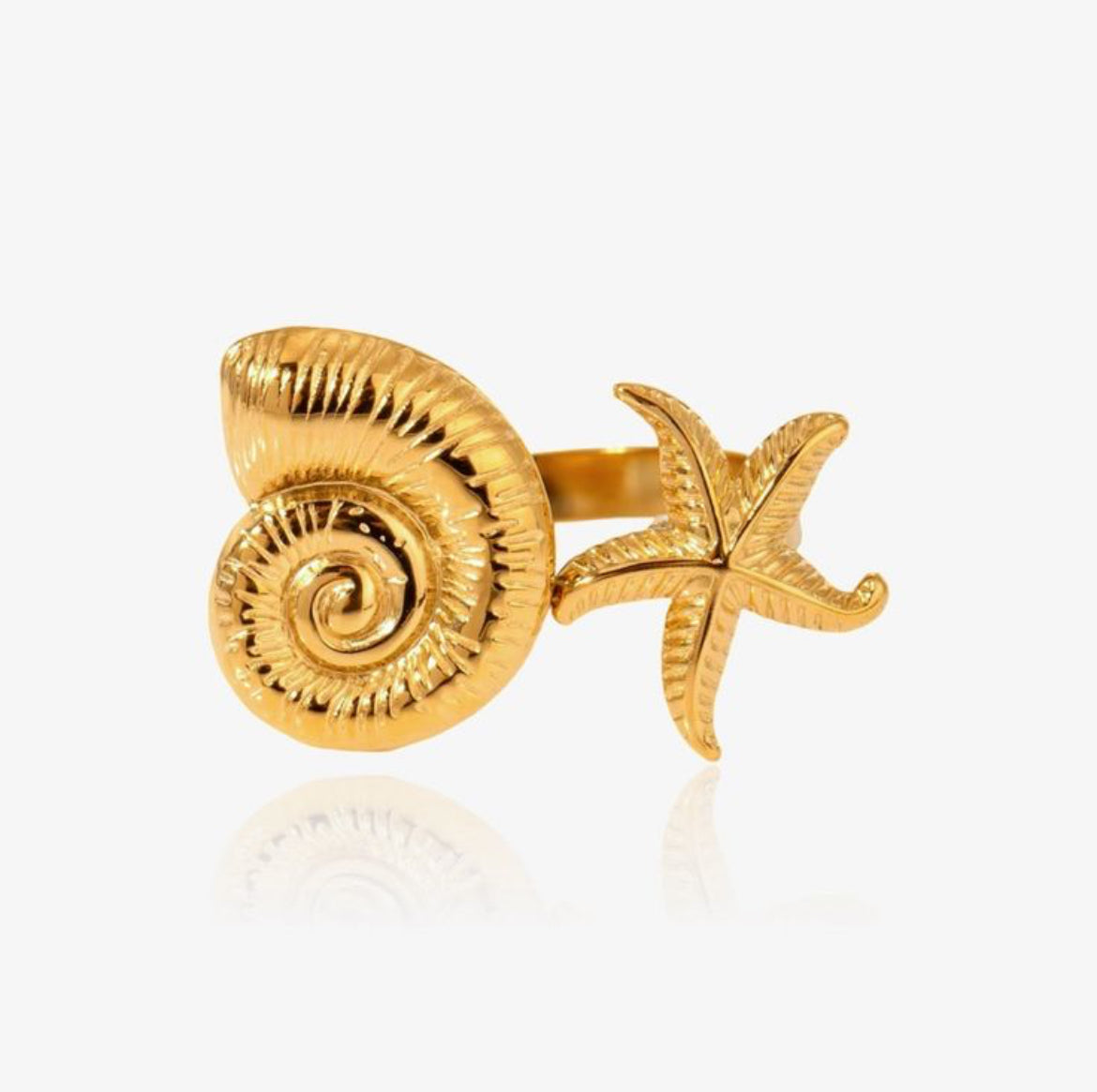 Our StarConch Ring is an exquisite piece of jewelry, made from high-quality stainless steel and finished with a fine 18-carat gold plating. This elegant design combines durability with timeless elegance.