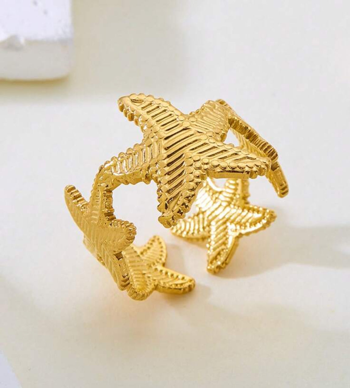 Our Starfish Ring is an exquisite piece of jewelry, made from high-quality stainless steel and finished with a fine 18-carat gold plating. This elegant design combines durability with timeless elegance.