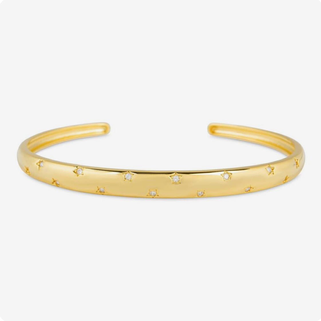 Our Starry Night Bangle is an exquisite piece of jewelry, made from high-quality stainless steel and finished with a fine 18-carat gold plating. This elegant design combines durability with timeless elegance.